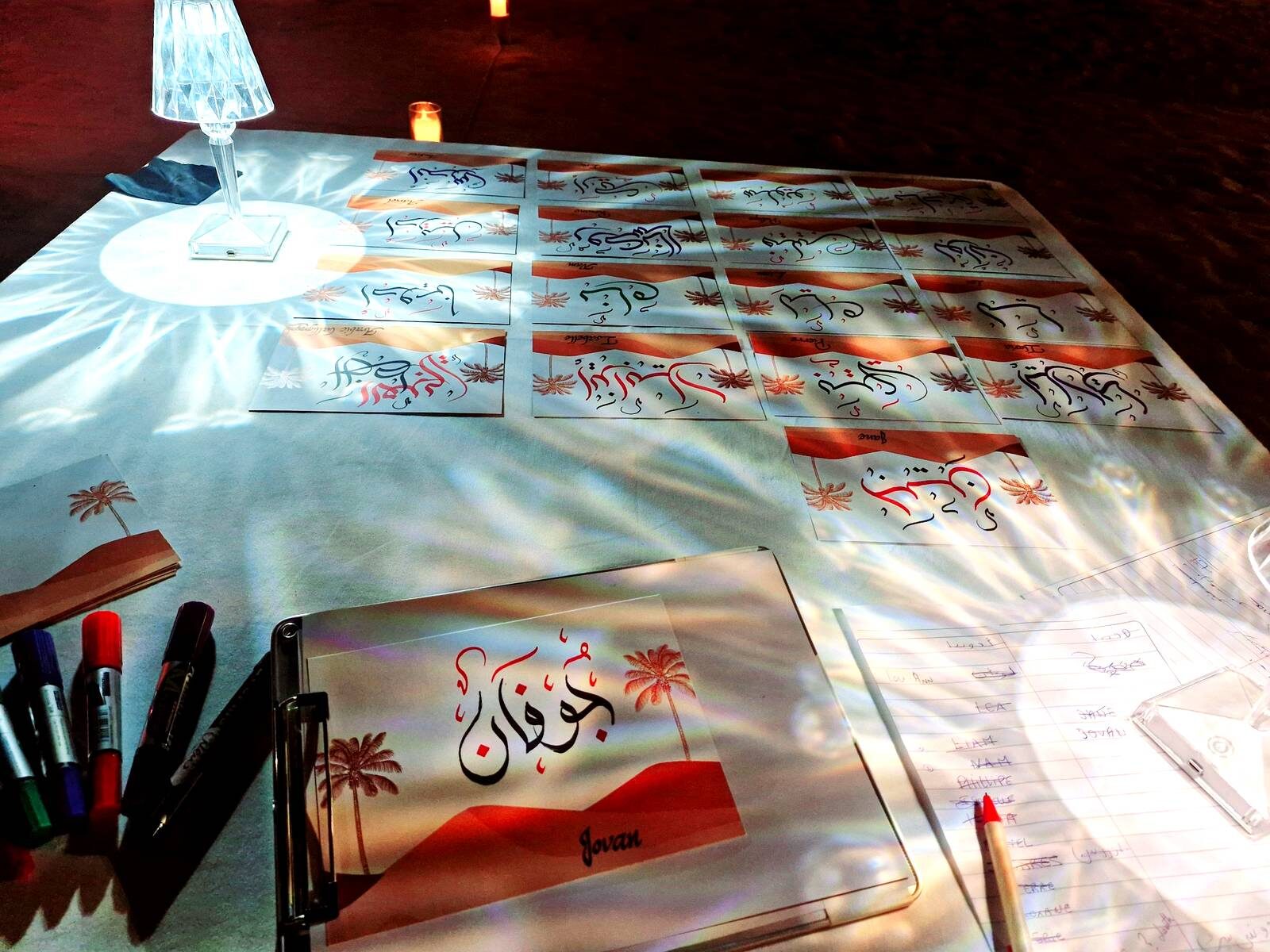 I offer a wide range of event calligraphy services, from live events and luxury brand activations to Eid calligraphy, wedding calligraphy, and personalized gifts in Dubai. Whether it’s Arabic calligraphy, modern calligraphy, or custom calligraphy on unique surfaces like paper, glass, leather, or perfume bottles, I bring creativity and precision to every project.
